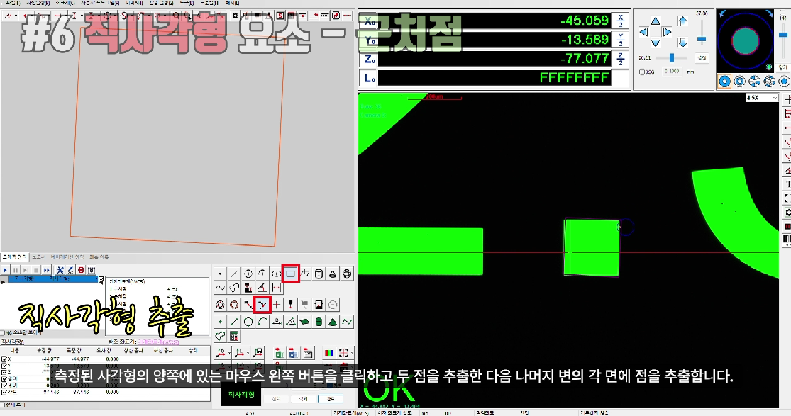 | ③ 여러 포인트를 캡처하여 사각형을 추출합니다 | 1단계: "직사각형" 요소 버튼과 해당 포인트 추출 버튼을 클릭하고 5개 이상을 설정한 다음 “자동” 확인란을 선택합니다. 2단계: 측정된 사각형의 양쪽에 마우스 왼쪽 버튼을 클릭해 점을 추출한 다음, 나머지 변의 각 면에서 점을 추출합니다. (참고: 마우스 커서의 색상이 변경될 때 마우스 왼쪽 버튼을 클릭하십시오 |